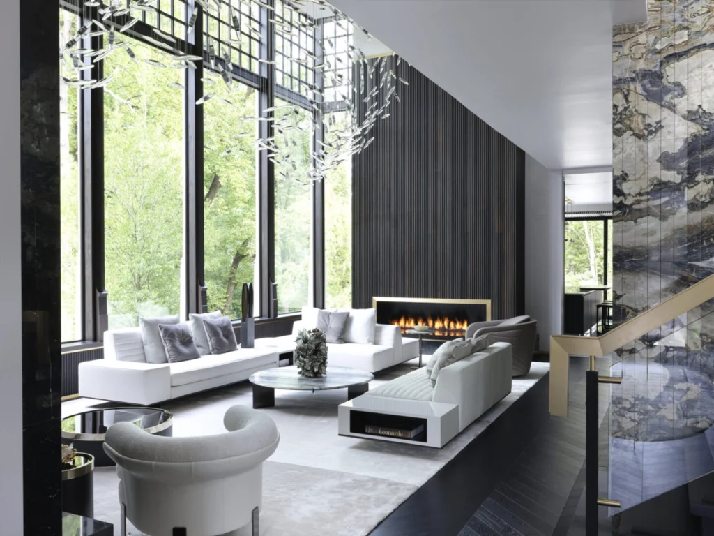 Note: The use of high-gloss surfaces (like the fireplace marble wall) effectively reflects the “bird” lights and the natural outdoor light, making the space feel even more expansive.