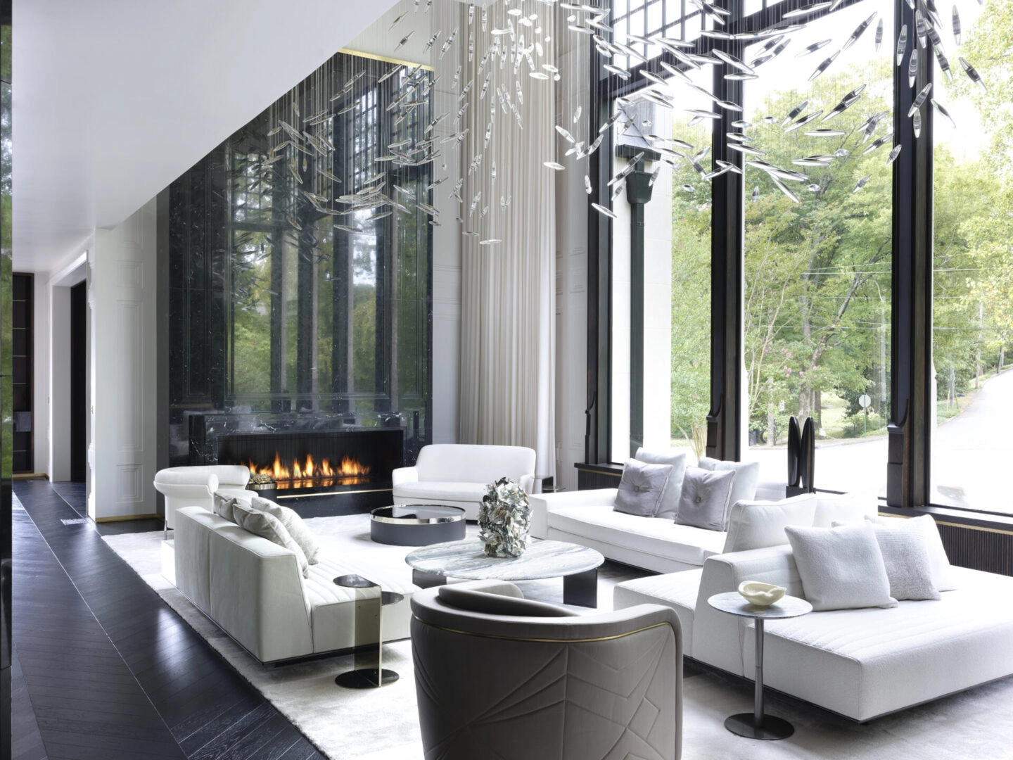 To master the scale of this double-height great room, we designed a breathtaking focal point. Hundreds of suspended crystal lights cascade from the ceiling, creating a luminous installation that mimics a murmuration—the fluid, shifting movement of birds in flight.